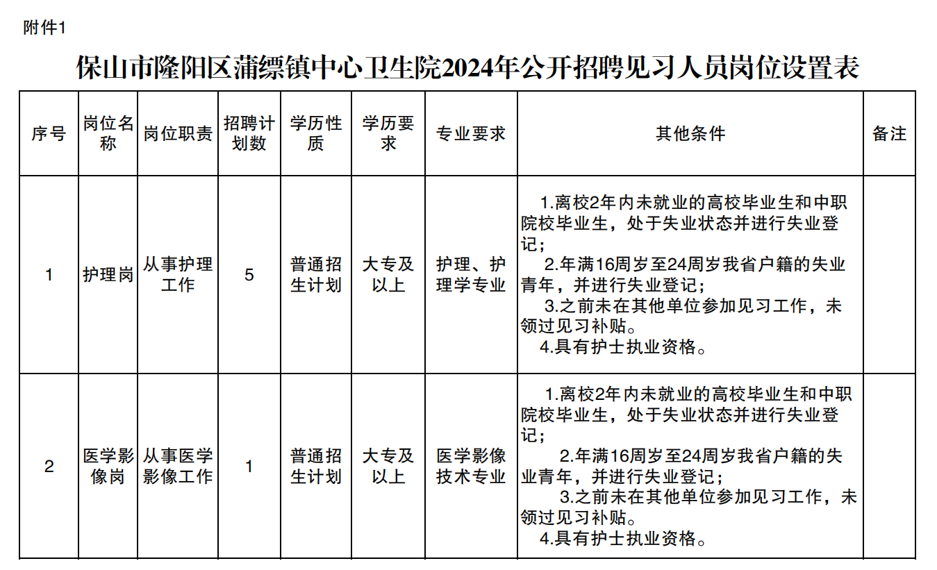 本次公開招聘見習(xí)人員6人,其中:護(hù)理崗5人、醫(yī)學(xué)影像崗1人。具體崗位要求詳見《隆陽區(qū)蒲縹鎮(zhèn)中心中心衛(wèi)生院2024年公開招聘見習(xí)人員崗位設(shè)置表》(附件1)。