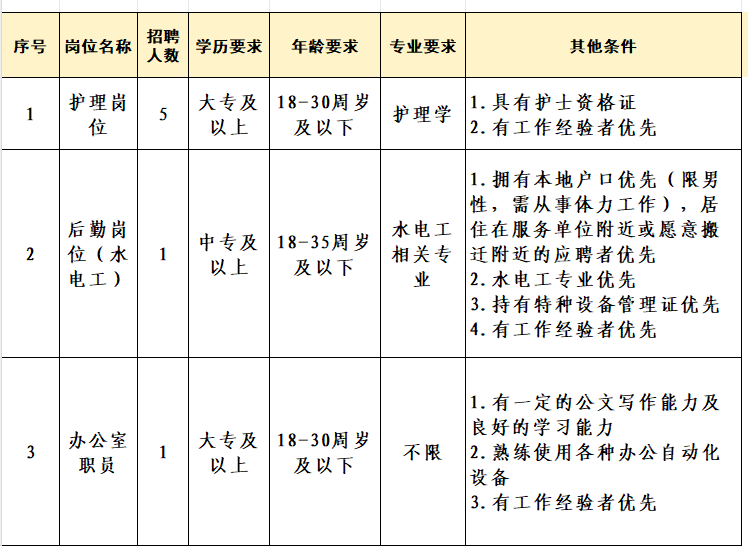 護理崗及后勤水電工崗位為:筆試、實操、面試;辦公室崗位為:面試。
