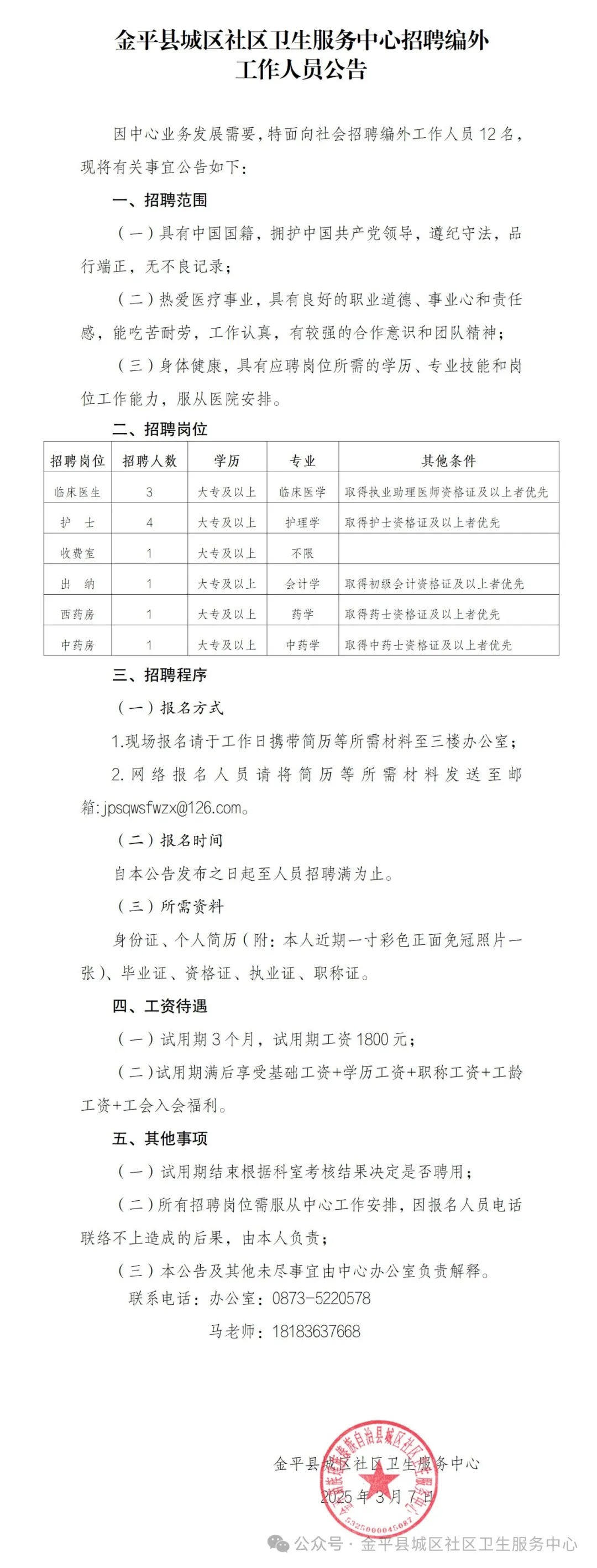 金平縣城區(qū)社區(qū)衛(wèi)生服務(wù)中心招聘編外工作人員公告
