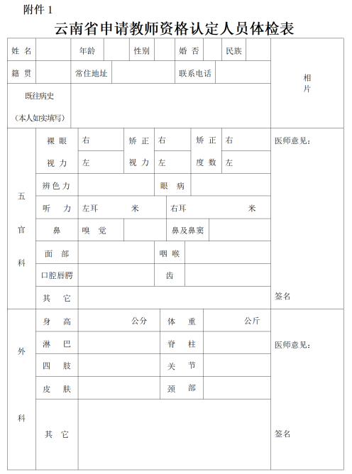 ①《云南省教師資格認(rèn)定體檢表》(附件1)由申請(qǐng)人下載雙面打印后,粘貼本人一寸照片自行到認(rèn)可醫(yī)院體檢。