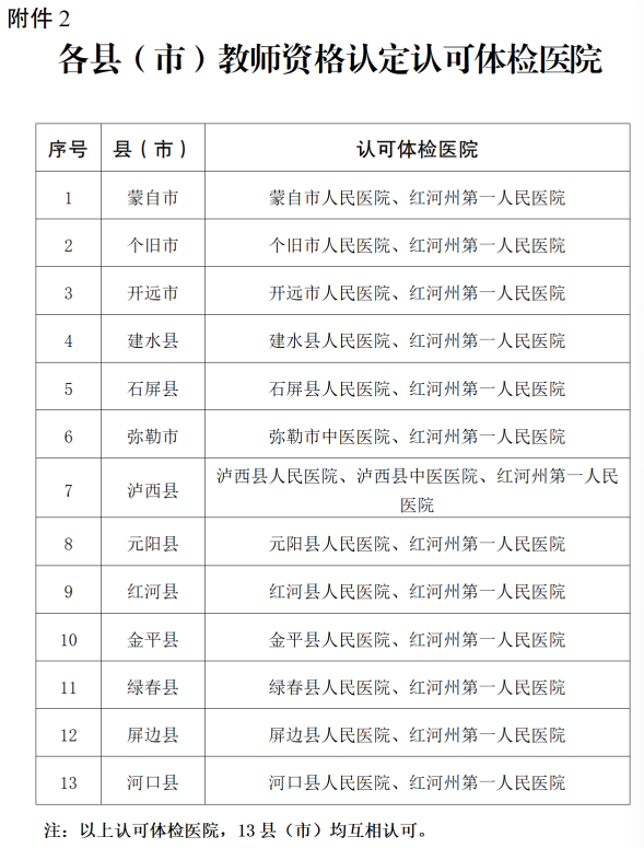 (7)《云南省申請(qǐng)教師資格認(rèn)定人員體檢表》原件(見(jiàn)附件1)。經(jīng)紅河州轄區(qū)內(nèi)縣級(jí)以上公立醫(yī)院體檢后(認(rèn)可體檢醫(yī)院詳見(jiàn)附件2),體檢結(jié)論簽署“合格”且有體檢醫(yī)院意見(jiàn)并加蓋公章的《云南省教師資格認(rèn)定體檢表》原件,體檢報(bào)告僅限當(dāng)次認(rèn)定有效。