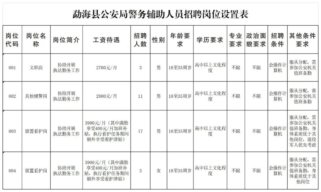 本次共招聘輔警34人,主要在勐??h公安局內(nèi)設(shè)機(jī)構(gòu)從事執(zhí)法勤務(wù)等工作。輔警不具有人民警察和公務(wù)員身份,不行使人民警察職權(quán)。具體崗位見(jiàn)《勐??h公安局警務(wù)輔助人員招聘崗位設(shè)置表》