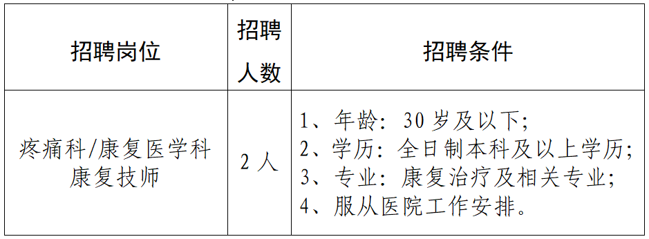 根據(jù)醫(yī)院業(yè)務(wù)發(fā)展需求,現(xiàn)需招聘疼痛科/康復醫(yī)學科康復技師2人,具體招聘條件如下: