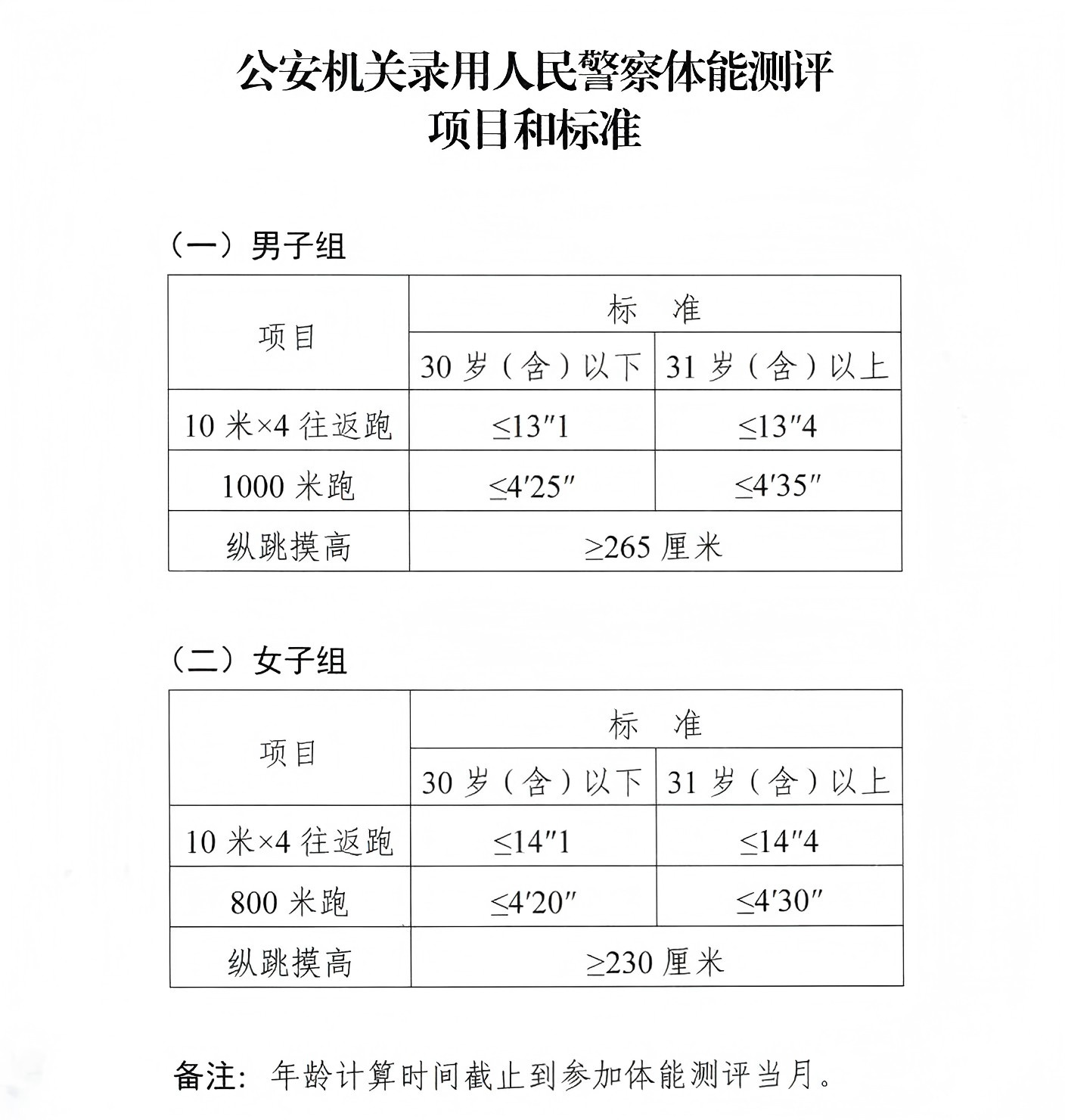 2.按照報名順序進行體能測評,體能測評參照中共中央組織部辦公廳、公安部辦公廳聯(lián)發(fā)的《公安機關(guān)錄用人民警察體能測評項目和標(biāo)準(zhǔn)》的標(biāo)準(zhǔn)和規(guī)定執(zhí)行,測評項目為,縱跳摸高各項目10米×4往返跑、男子1000米跑、女子800名跑(合格標(biāo)準(zhǔn)附后)。其中:特巡警大隊?wèi)?yīng)急處置中隊輔警體測項目為:縱跳摸高(合格標(biāo)準(zhǔn)同前),10米×4往返跑(合格標(biāo)準(zhǔn)同前)、2000米跑(男:≤9′30″,女:≤12′00″)、立定跳遠(yuǎn)(男:≥2.30m,女≥1.80m),男:引體向上(正手≥5 個)、一分鐘俯臥撐(≥28個),女:一分鐘仰臥起坐(≥30個)。