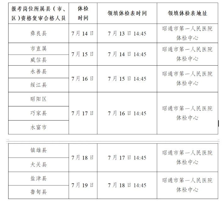 2.體檢時間及地點。2025年7月14日至7月19日,每天上午07:15,考生準時到達昭通市第一人民醫(yī)院新門診樓十單元健康管理中心一樓服務(wù)臺集合。具體時間見下表。