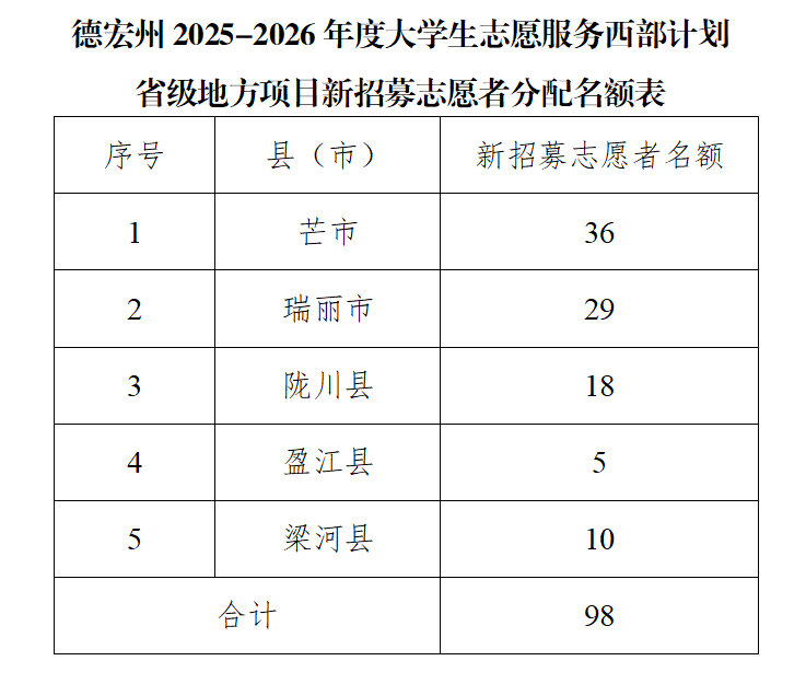 本年度德宏州擬新招募大學(xué)生西部計(jì)劃省級(jí)地方項(xiàng)目志愿者98名,具體請(qǐng)見(jiàn)名額分配表。