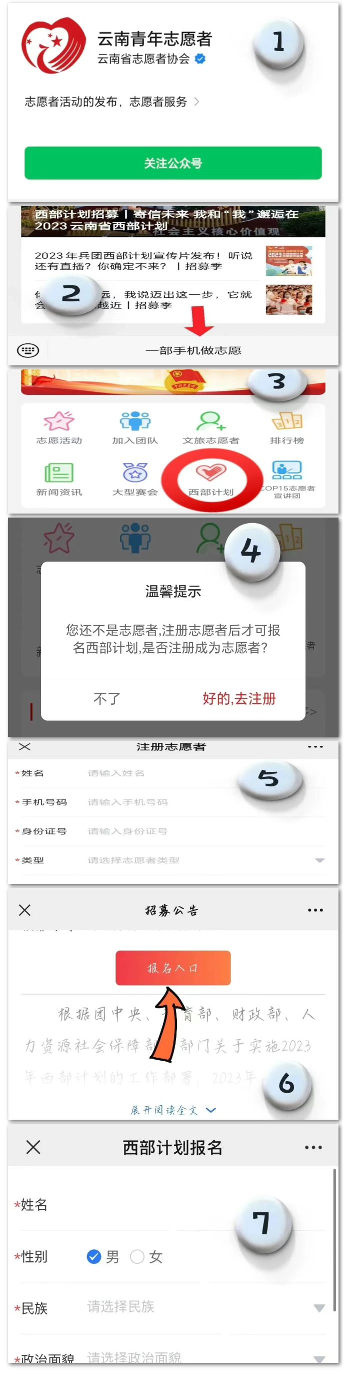 1.提交報(bào)名申請(qǐng)。本次招募采取網(wǎng)上報(bào)名。即日起至6月10日,報(bào)名人員關(guān)注微信公眾號(hào)“云南青年志愿者”,點(diǎn)擊“一部手機(jī)做志愿”——“西部計(jì)劃”——“注冊(cè)志愿者”——“報(bào)名入口”填寫(xiě)個(gè)人相關(guān)信息資料,填寫(xiě)報(bào)名表并選擇意向服務(wù)縣,提交報(bào)名申請(qǐng)。報(bào)名時(shí)在網(wǎng)上所提交的申請(qǐng)材料必須真實(shí)、準(zhǔn)確,因網(wǎng)上報(bào)名提交的申請(qǐng)材料不真實(shí)、不完整或者錯(cuò)誤填寫(xiě)報(bào)名信息,而造成網(wǎng)上資格審查、面試資格審查、考察不通過(guò)等后果,由報(bào)名人員自行承擔(dān)責(zé)任。