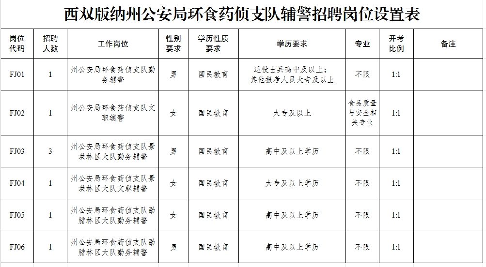 西雙版納州公安局環(huán)食藥偵支隊(duì)警務(wù)輔助人員招聘公告