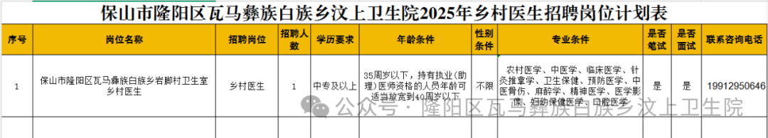 為進(jìn)一步加強(qiáng)保山市隆陽(yáng)區(qū)瓦馬彝族白族鄉(xiāng)汶上衛(wèi)生院轄區(qū)各村鄉(xiāng)村醫(yī)生隊(duì)伍建設(shè),合理配備鄉(xiāng)村醫(yī)生,更好的滿足農(nóng)村居民日益增長(zhǎng)的醫(yī)療衛(wèi)生需求,貫徹落實(shí)“強(qiáng)基層”的重要目標(biāo),推動(dòng)保山市隆陽(yáng)區(qū)瓦馬彝族白族鄉(xiāng)汶上衛(wèi)生院衛(wèi)生健康事業(yè)的發(fā)展,保山市隆陽(yáng)區(qū)瓦馬彝族白族鄉(xiāng)汶上衛(wèi)生院決定對(duì)汶上衛(wèi)生院轄區(qū)巖腳村衛(wèi)生室鄉(xiāng)村醫(yī)生崗位進(jìn)行公開招聘,現(xiàn)將有關(guān)事項(xiàng)公告如下: