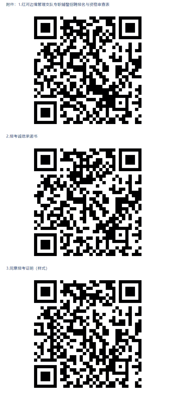 (2)報(bào)名時(shí)需提交《紅河邊境管理支隊(duì)專職輔警招聘報(bào)名與資格審查表》(見附件1,粘貼近期免冠半寸彩色照片)一式一份,攜帶本人身份證、戶口本、畢業(yè)證、征信報(bào)告、報(bào)考誠(chéng)信承諾書(見附件2)、單位同意報(bào)考證明(見附件3,無工作單位的不提供)以及優(yōu)先招聘條件所需的其他證明材料原件及復(fù)印件1份。
