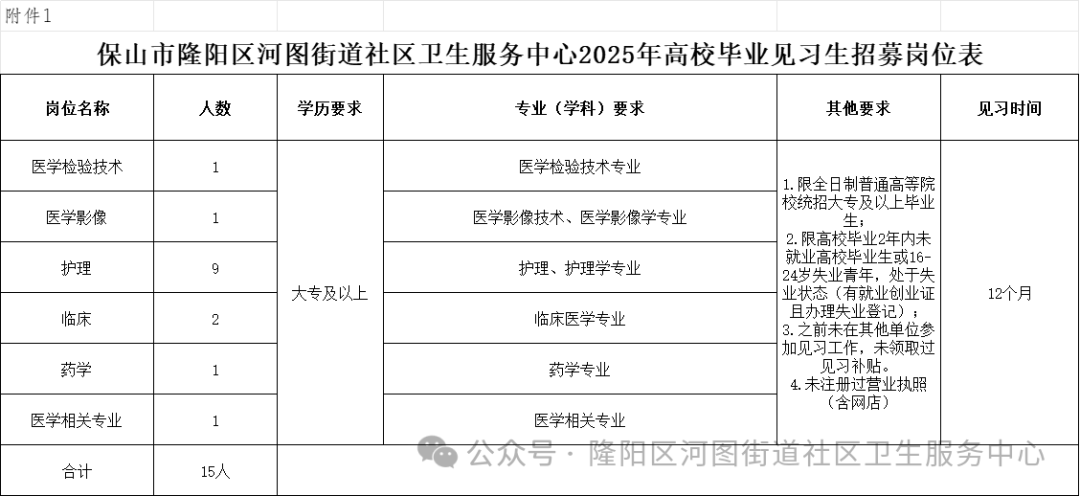 本次招募崗位為保山市隆陽區(qū)河圖街道社區(qū)衛(wèi)生服務(wù)中心2025年高校畢業(yè)見習(xí)生,招募人數(shù)15人,崗位具體要求詳見《保山市隆陽區(qū)河圖街道社區(qū)衛(wèi)生服務(wù)中心2025年招募見習(xí)人員崗位設(shè)置表》。