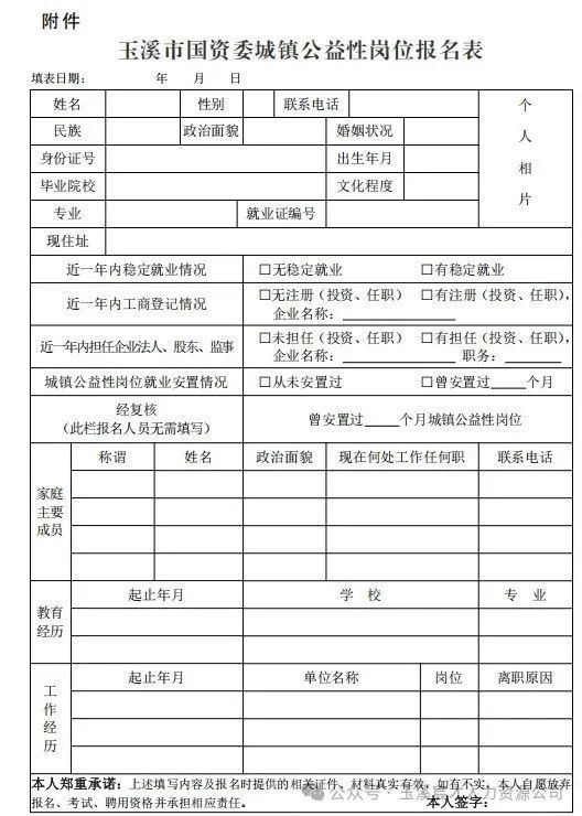 附件:玉溪市人民政府國(guó)有資產(chǎn)監(jiān)督管理委員會(huì)城鎮(zhèn)公益性崗位報(bào)名表