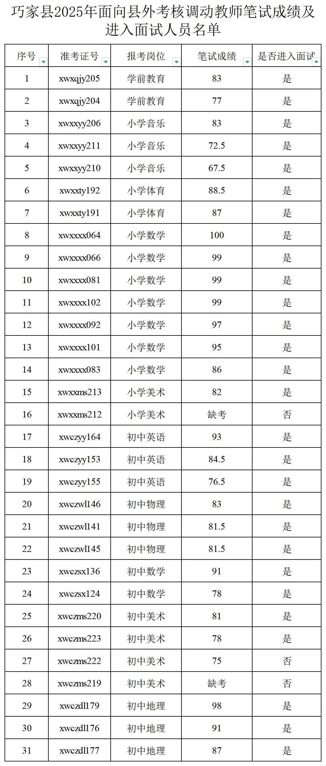 2.巧家縣2025年面向縣外考核調(diào)動教師筆試成績及進(jìn)入面試人員名單