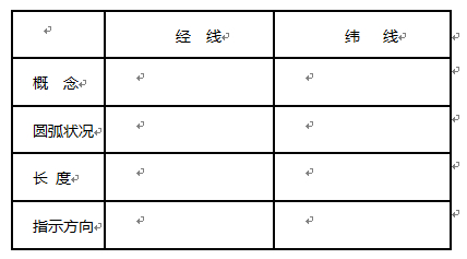 [教師引導(dǎo)] 球面上有些什么線?這些線的特征與作用?學(xué)生看書,觀察地球儀,然后討論完成表格內(nèi)容(教師巡視、指導(dǎo))。