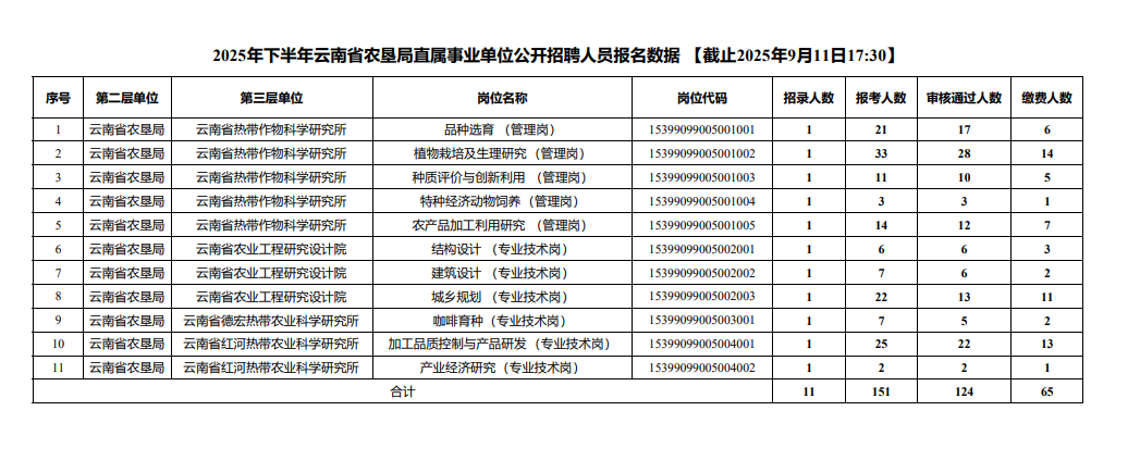 現(xiàn)將2025年下半年云南省農(nóng)墾局直屬事業(yè)單位公開招聘人員報名數(shù)據(jù)【截止2025年9月11日17:30】公布如下: