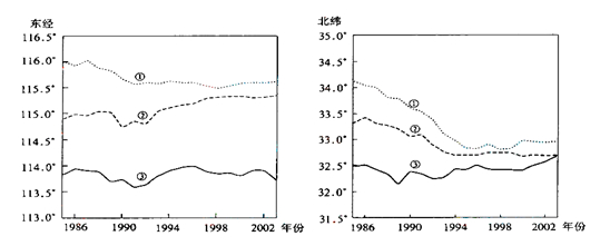 產(chǎn)業(yè)重心是區(qū)域產(chǎn)業(yè)產(chǎn)值空間分布的重心。下圖所示為中國三次產(chǎn)業(yè)重心的經(jīng)、緯度變化(不含臺(tái)灣、香港、澳門的統(tǒng)計(jì)資料)。完成21~23題。