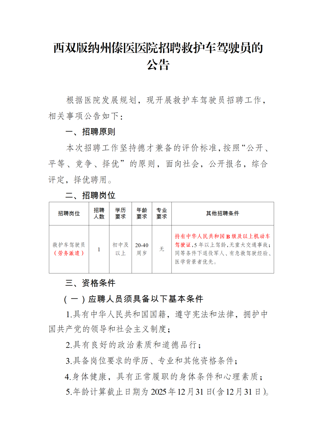 西雙版納州傣醫(yī)醫(yī)院招聘救護(hù)車(chē)駕駛員的公告