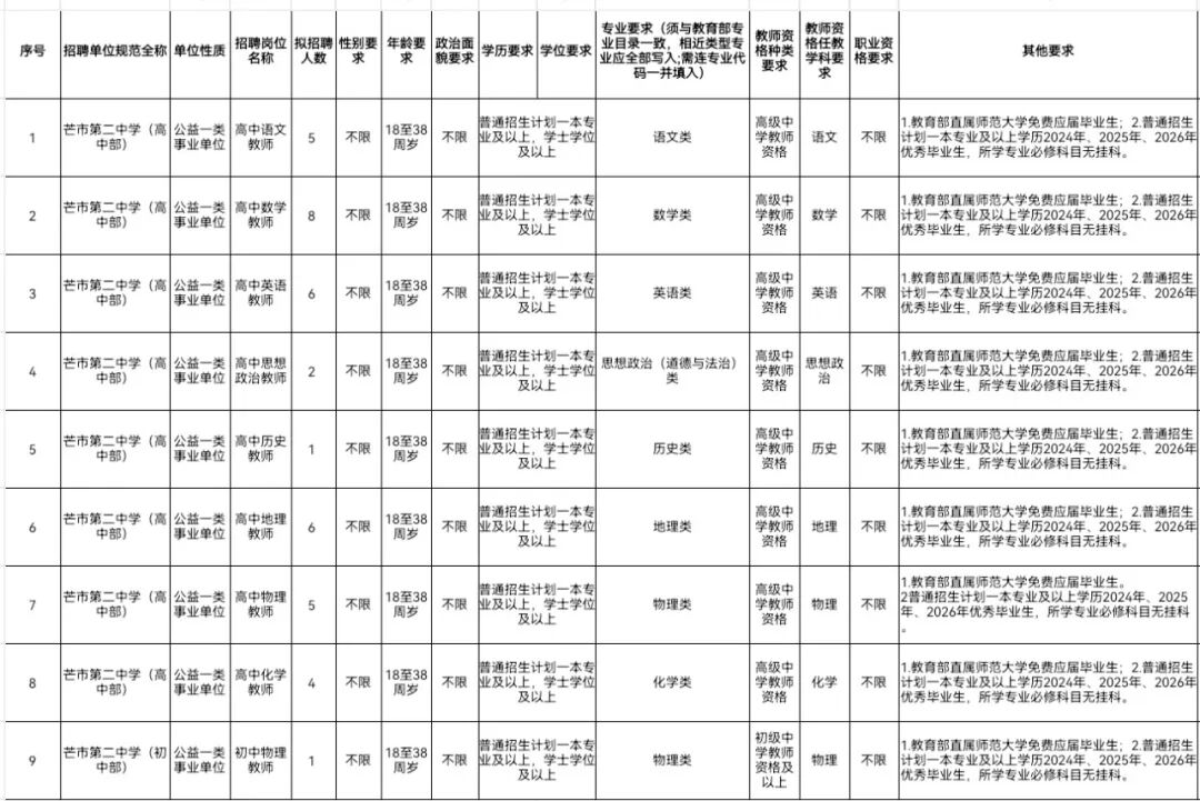 芒市第二中學(xué)2026年考核招聘緊缺專(zhuān)業(yè)學(xué)科優(yōu)秀人才38人
