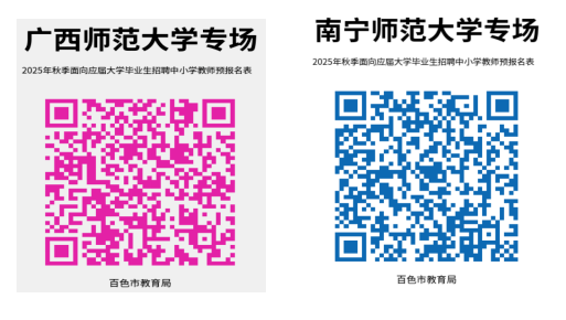 南寧師范大學(xué)專場(chǎng):2025年11月16日至11月17日,在廣西師范大學(xué)專場(chǎng)已簽約的崗位核減后,剩余崗位用于南寧師范大學(xué)專場(chǎng)招聘,南寧師范大學(xué)專場(chǎng)的應(yīng)聘人員可通過網(wǎng)絡(luò)進(jìn)行預(yù)報(bào)名,使用QQ或微信掃描《百色市2025年秋季面向應(yīng)屆大學(xué)畢業(yè)生招聘中小學(xué)教師公告》中的二維碼(南寧師范大學(xué)專場(chǎng)),如實(shí)填寫個(gè)人相關(guān)信息,并提交報(bào)名表。應(yīng)聘人員網(wǎng)絡(luò)預(yù)報(bào)名后,須按現(xiàn)場(chǎng)報(bào)名方式到現(xiàn)場(chǎng)提交報(bào)名材料,且在一個(gè)專場(chǎng)只能填報(bào)一個(gè)崗位。