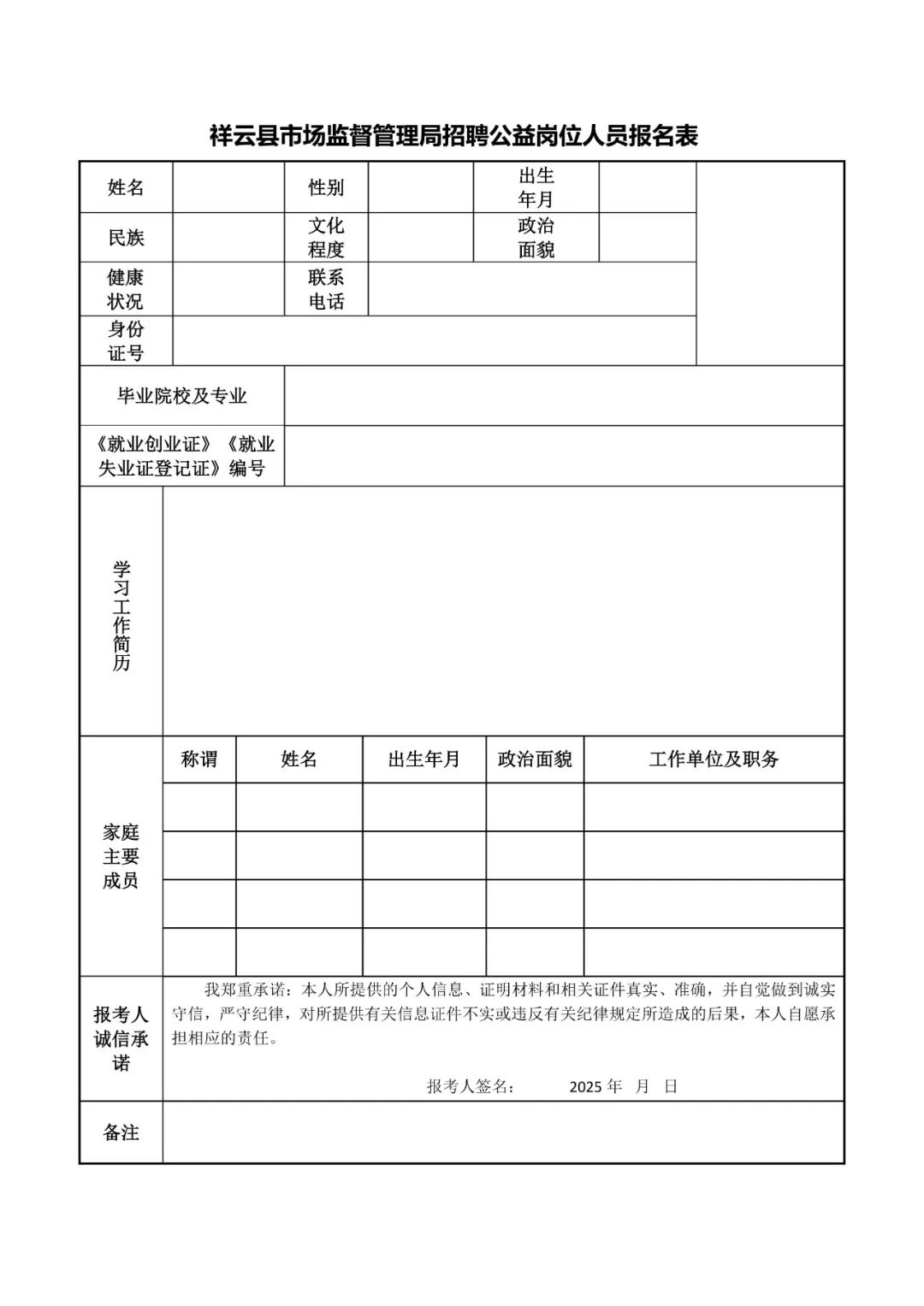 附件:祥云縣市場監(jiān)督管理局招聘公益性崗位人員報名表