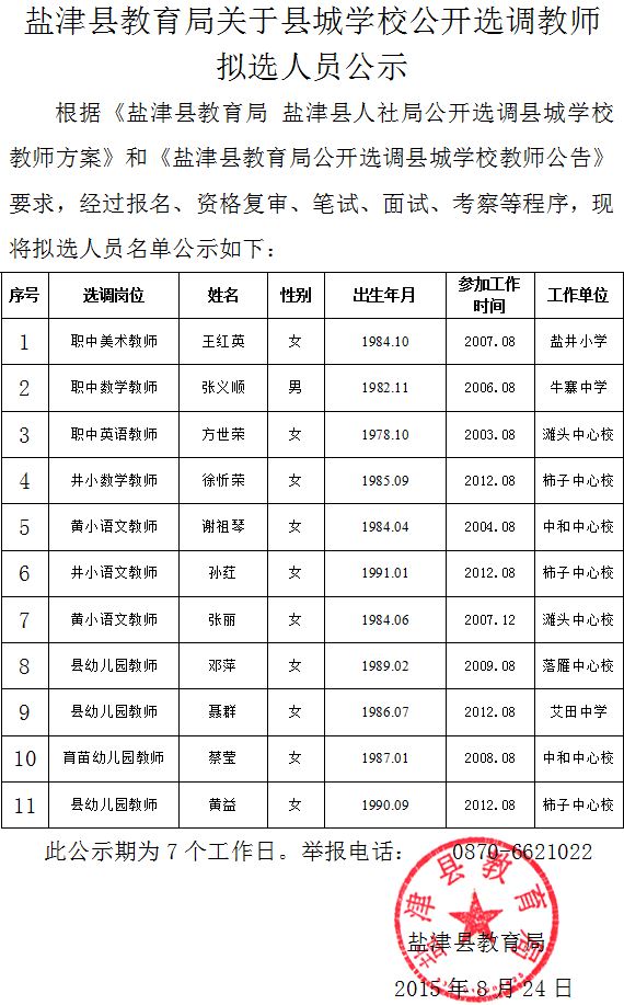 鹽津縣城學(xué)校2015年選調(diào)教師擬選人員的公示