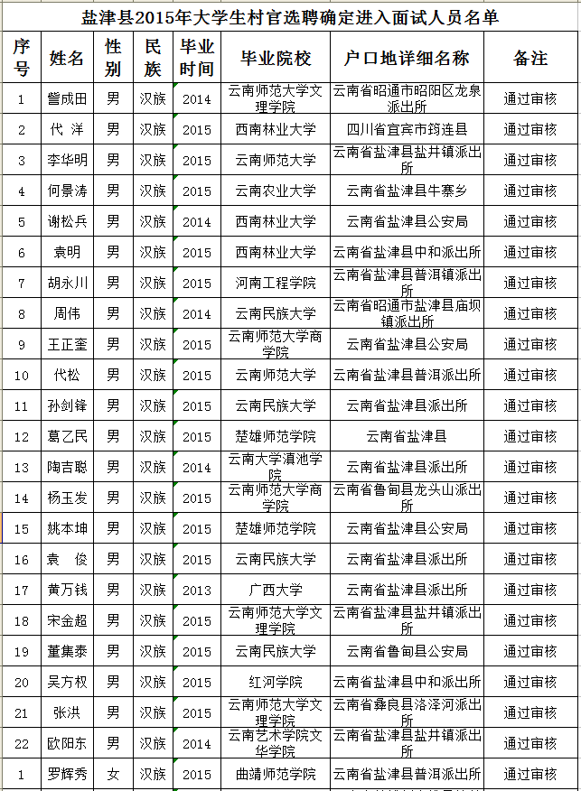 附件:鹽津縣2015年大學生村官選聘確定進入面試人員名單