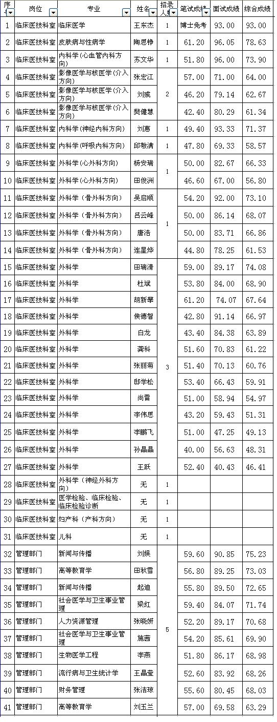 按照上級要求,現(xiàn)將參加我院2015年公開招聘人員筆試、面試成績分崗位按分數(shù)高低排序進行公示。筆試、面試成績附后。