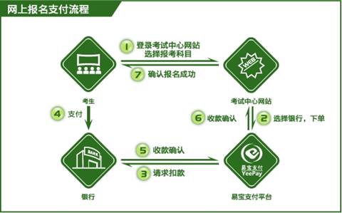 2、網(wǎng)上預(yù)報(bào)名后,請您登陸繳費(fèi)頁面,選擇易寶支付提供的支付方式進(jìn)行繳費(fèi)。繳費(fèi)流程圖如下: