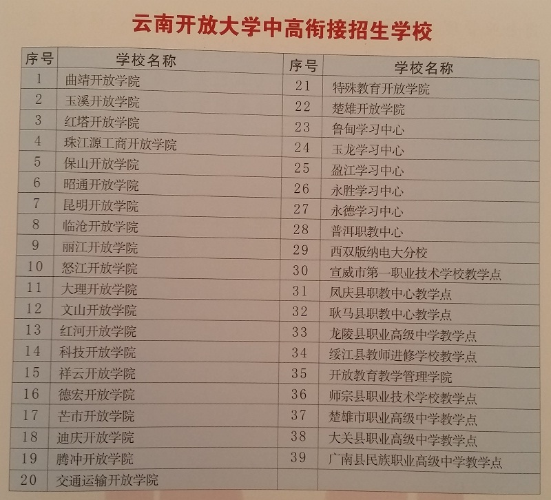 3、招生學(xué)校:經(jīng)批準(zhǔn)開展云南開放大學(xué)中高銜接招生的云南開放大學(xué)各開放學(xué)院、學(xué)習(xí)中心和相關(guān)中職學(xué)校,具體招生學(xué)校名單如下: