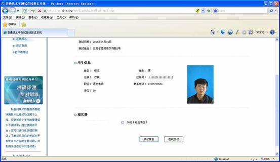 第一步:考生報名完成后,請核對本人報名信息(請考生在繳費確認前仔細核對個人報名信息,繳費成功后不予修改,準考證上個人信息與本人身份證信息不符的考生不得參加測試,責任自負),信息有誤請先點擊上圖中“修改信息”按鈕進行修改。