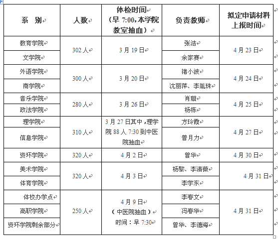 1、體檢時(shí)間安排:負(fù)責(zé)教師于當(dāng)日7:00在學(xué)校田徑場(chǎng)接醫(yī)生到本學(xué)院抽血地點(diǎn)。