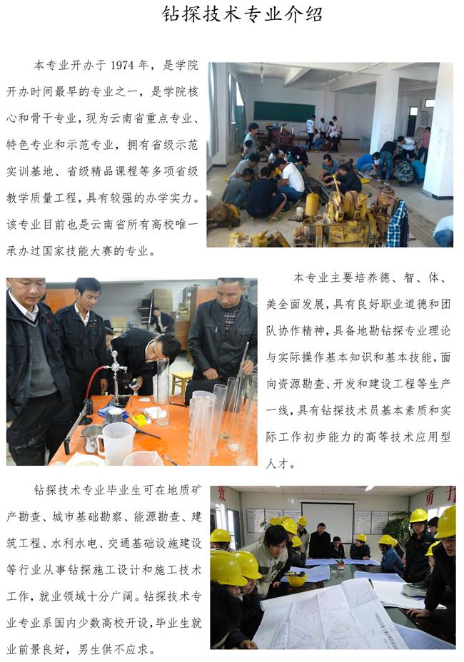 應(yīng)用工程學(xué)院現(xiàn)設(shè)置有鉆探技術(shù)、基礎(chǔ)工程技術(shù)、安全技術(shù)管理、環(huán)境監(jiān)測(cè)與治理技術(shù)、金屬礦開采技術(shù)等5個(gè)專業(yè),長(zhǎng)期致力為云南省區(qū)域經(jīng)濟(jì)發(fā)展培養(yǎng)急缺的高等技術(shù)應(yīng)用型人才。在十幾年的發(fā)展過程中,應(yīng)用工程學(xué)院始終遵循“以能力為導(dǎo)向”的高等職業(yè)教育辦學(xué)要求,立足產(chǎn)業(yè)行業(yè)發(fā)展,面向生產(chǎn)實(shí)際需要,強(qiáng)化校企合作,深化專業(yè)教育教學(xué)改革,開設(shè)的專業(yè)均構(gòu)建了以工作過程系統(tǒng)化的課程體系,形成了工學(xué)結(jié)合的人才培養(yǎng)模式,專業(yè)教育教學(xué)改革成果成果豐碩,人才培養(yǎng)質(zhì)量提到不斷提升。其中,鉆探技術(shù)專業(yè)現(xiàn)為云南省重點(diǎn)專業(yè)、特色專業(yè)和省級(jí)示范專業(yè),建有校內(nèi)、校外省級(jí)示范實(shí)習(xí)實(shí)訓(xùn)基地各1個(gè),省級(jí)精品課程1門,校級(jí)精品課程5門,辦學(xué)實(shí)力為國(guó)內(nèi)相同專業(yè)最強(qiáng)。依托于該專業(yè),學(xué)校多次承辦云南省鉆探技能大賽,2011年11月還成功承辦了第一屆全國(guó)地勘鉆探職業(yè)技能大賽,獲得國(guó)家相關(guān)部委的表彰。2014年,安全技術(shù)管理專業(yè)成功申報(bào)“云南省高職院校提升專業(yè)服務(wù)產(chǎn)業(yè)能力建設(shè)項(xiàng)目”,獲得省財(cái)政廳和教育廳150萬(wàn)元的建設(shè)資金。同時(shí),依托云南省世行貸款高職院校建設(shè)項(xiàng)目,基礎(chǔ)工程技術(shù)、環(huán)境監(jiān)測(cè)與治理技術(shù)和金屬礦開采技術(shù)等專業(yè)在專業(yè)建設(shè)和實(shí)訓(xùn)條件建設(shè)上得到大額資金的支持,專業(yè)辦學(xué)實(shí)力都將得到較大提升。