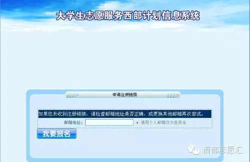 3.申請注冊鏈接。點(diǎn)擊右側(cè)下方的“志愿者報名”進(jìn)入申請注冊鏈接頁面(http://west.youth.cn/password_save/login.jsp),填寫郵箱地址完成申請注冊鏈接。