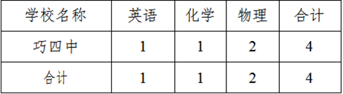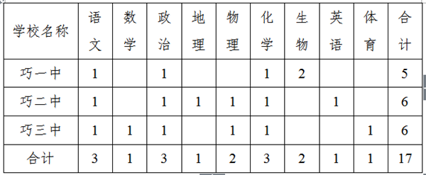 巧一中5名,巧二中6名,巧三中6名,巧四中4名,新華小學(xué)6名,白鶴灘鎮(zhèn)中心學(xué)校7名,附小3名,職業(yè)高級(jí)中學(xué)3名,縣幼兒園2名,教科中心9名,共51名。