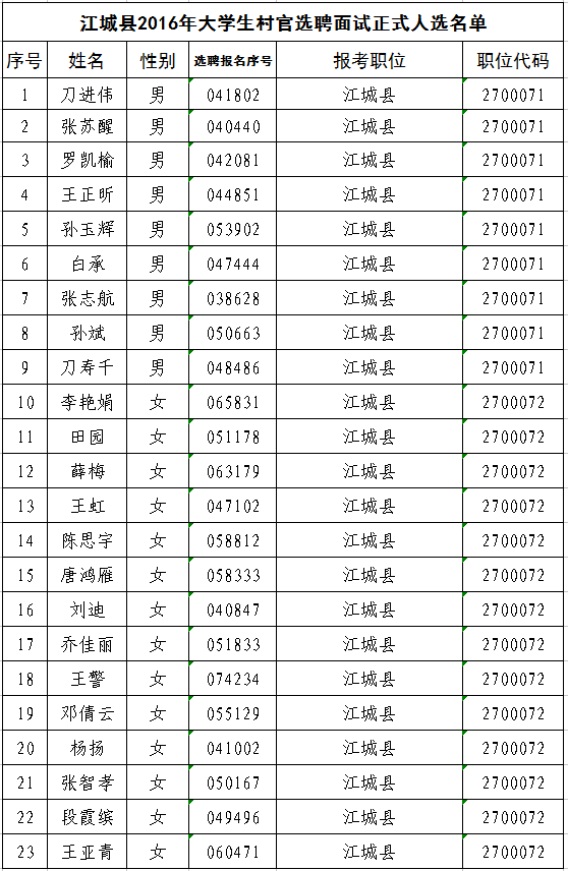 附件:《江城縣2016年大學(xué)生村官選聘面試正式人選名單》