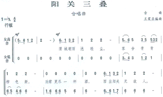 《陽關(guān)三疊》是古代文人有感于一位從軍朋友的別離之情而寫的歌曲,它含蓄地反映了人民在不合理的征戍徭役制度壓迫下的哀怨情緒。全曲分三大段,基本上用一個曲調(diào)作變化反復(fù),疊唱三次。這首琴歌的音調(diào)純樸而富有激情,特別是后段“遄行,遄行”等處的八度大跳,以及“歷苦辛”處的連續(xù)反復(fù)呈述,情意真切,激動而沉郁,充分表達(dá)出作者對即將遠(yuǎn)行的友人那種無限關(guān)懷、留戀的誠摯情感。1954年王震亞將此曲改編為合唱曲。