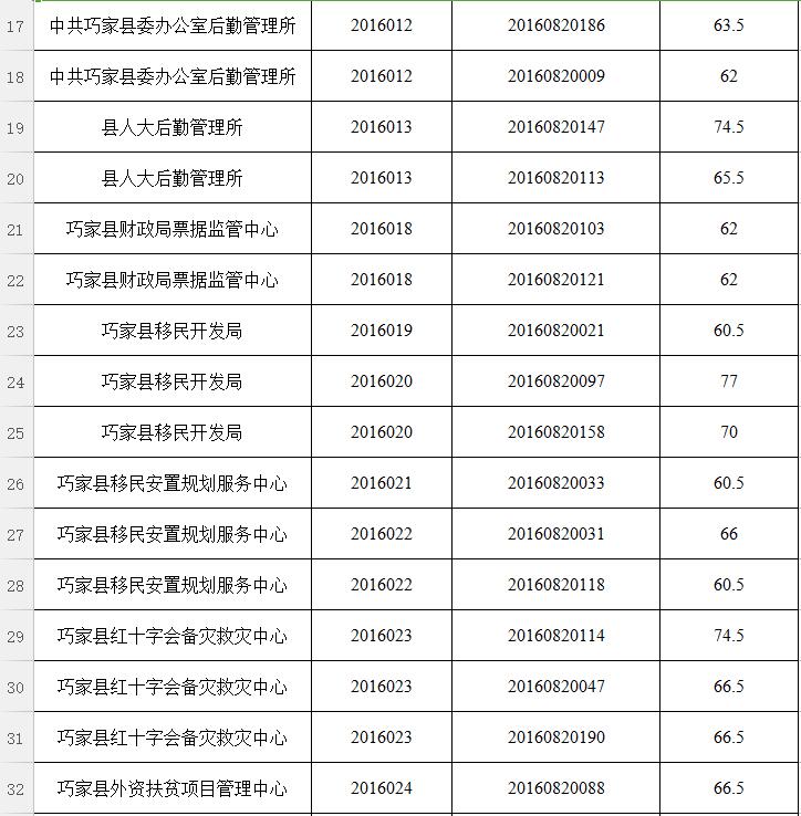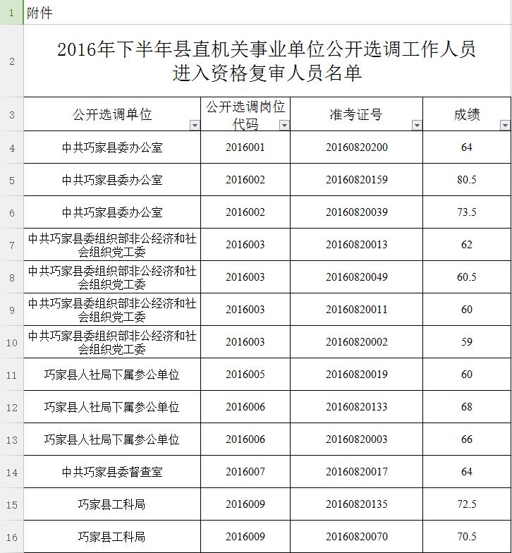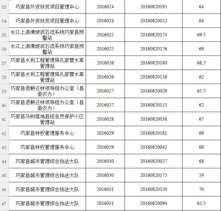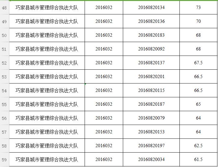 經(jīng)巧家縣縣直機(jī)關(guān)事業(yè)單位2016年下半年公開(kāi)選調(diào)工作領(lǐng)導(dǎo)組研究決定,本次公開(kāi)選調(diào)筆試最低合格分?jǐn)?shù)線確定為55分。筆試總成績(jī)達(dá)不到最低控制分?jǐn)?shù)線的考生,不得進(jìn)入資格復(fù)審、面試、考察和業(yè)績(jī)?cè)u(píng)價(jià)等環(huán)節(jié)。對(duì)達(dá)到最低合格分?jǐn)?shù)控制線以上人員,按崗位選調(diào)人數(shù)比例1:2的比例確定資格復(fù)審人員,分?jǐn)?shù)并列的,一同列入資格復(fù)審,分?jǐn)?shù)超過(guò)控制線人數(shù)不足崗位1:2要求的,按1:1進(jìn)入資格復(fù)審,名單附后。