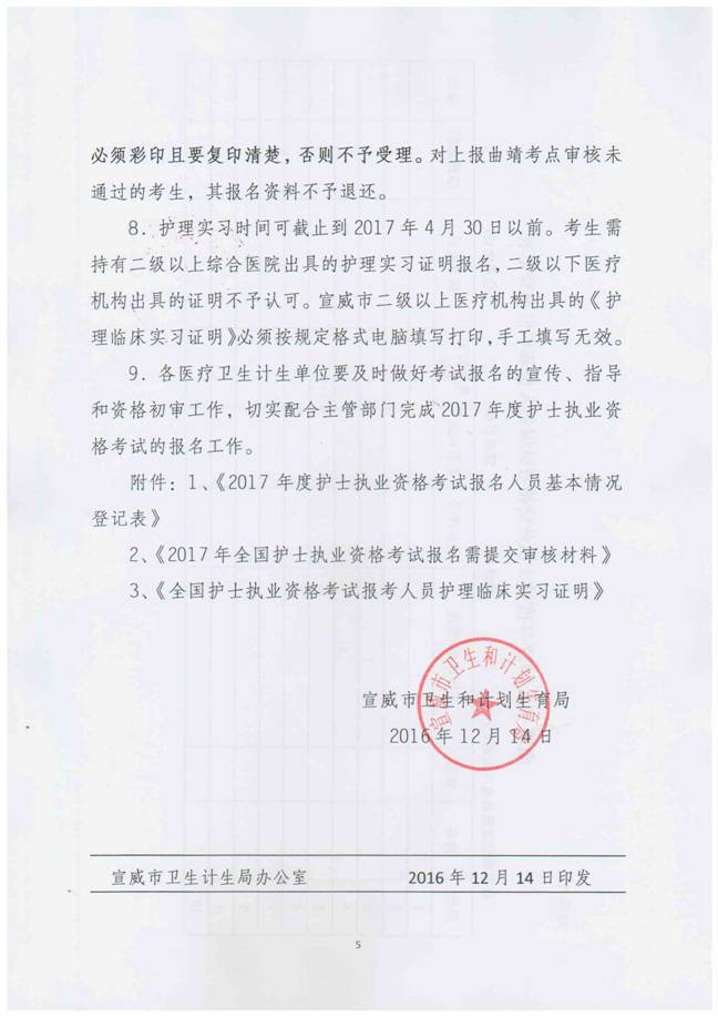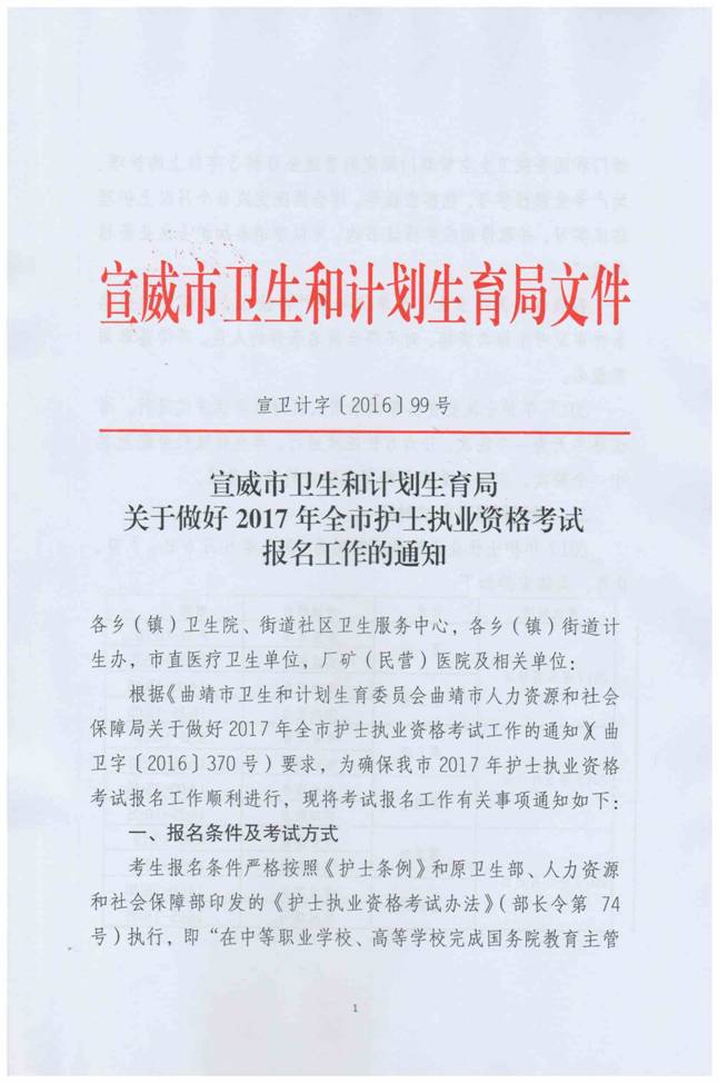 宣威市衛(wèi)生計生局現(xiàn)場審核時間為2016年12月19日-2017年1月5日。請各醫(yī)療衛(wèi)生計生單位及時通知護(hù)理人員報名并進(jìn)行現(xiàn)場審核,逾期將不再審核確認(rèn),導(dǎo)致無法參加考試的責(zé)任自負(fù)。