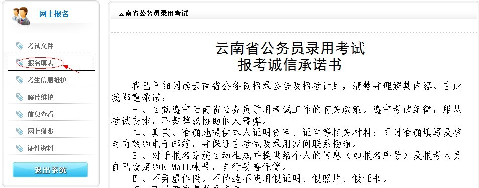 7、點(diǎn)擊左側(cè)“報(bào)名填表”查看報(bào)考誠(chéng)信承諾書(shū);