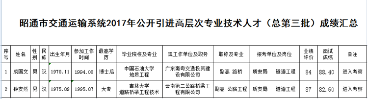 按照《昭通市交通運輸系統(tǒng)2016年公開引進高層次專業(yè)技術(shù)人才通告(第三批)》規(guī)定,現(xiàn)將昭通市交通運輸系統(tǒng)2017年公開引進高層次專業(yè)技術(shù)人才經(jīng)歷業(yè)績評價和面試成績予以公示,公示期為7天。如有意見,請及時向有關(guān)部門反映。