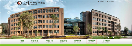 一、進(jìn)入云南藝術(shù)學(xué)院校園網(wǎng)(http://www.ynart.edu.cn/index.shtml),點(diǎn)擊首頁上方導(dǎo)航條中“藝考網(wǎng)”鏈接,進(jìn)入藝考網(wǎng)首頁。