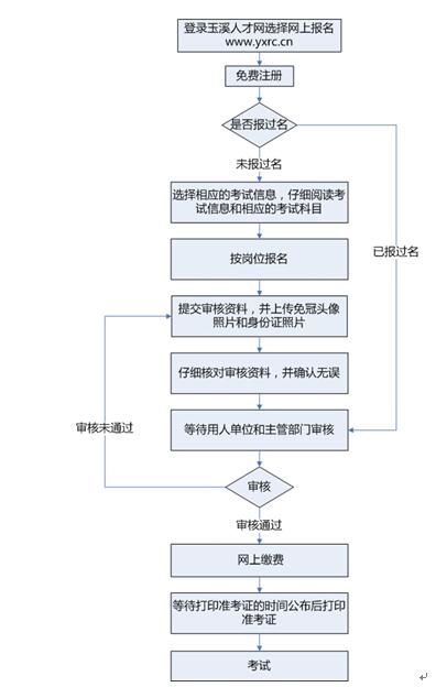 網(wǎng)絡(luò)報名的大致流程為:登錄玉溪人才網(wǎng)→網(wǎng)上報名入口→注冊→查看招聘崗位→按崗位報名并填寫報名資料→等待審核→審核通過→網(wǎng)上交費(注意查看交費狀態(tài),確認交費成功)→打印筆試準考證(打印時間在筆試公告內(nèi)另行通知)→參加筆試。