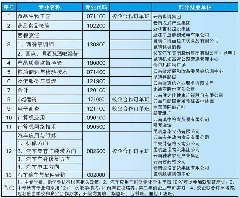 入學(xué)后,學(xué)生可以選擇云南開放大學(xué)生物技術(shù)及應(yīng)用、會計電算化、電子商務(wù)、市場營銷、計算機應(yīng)用技術(shù)、計算機網(wǎng)絡(luò)技術(shù)、汽車技術(shù)服務(wù)與營銷、汽車檢測與維護技術(shù)等專業(yè);云南農(nóng)業(yè)大學(xué)、河南工業(yè)大學(xué)、武漢輕工業(yè)大學(xué)、哈爾濱商業(yè)大學(xué)的會計學(xué)、工商管理、食品生物工藝、食品營養(yǎng)與檢測、糧油儲藏與檢驗技術(shù)等專業(yè),獲得大專及本科的學(xué)歷。實現(xiàn)中專、大專、本科的中高職銜接和學(xué)歷提升。為今后的就業(yè)、升職做好知識和能力的儲備。
