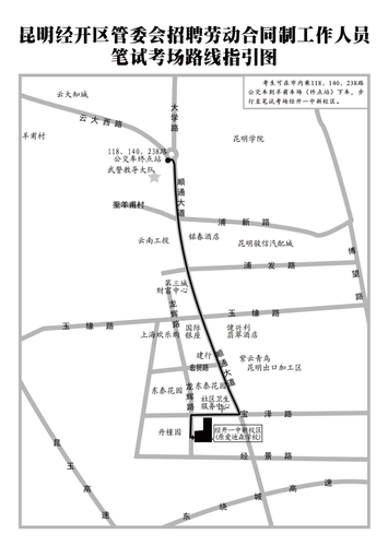 筆試地點(diǎn)在經(jīng)開(kāi)區(qū)第一中學(xué)新校區(qū)(原愛(ài)迪生學(xué)校),地址:昆明市出口加工區(qū)龍輝路丹槿園小區(qū)對(duì)面。市內(nèi)可乘118、140、238路公交車(chē)至羊甫車(chē)場(chǎng)下車(chē),沿順通大道往第三城方向前行1.5公里至寶澤路右轉(zhuǎn)至丹槿園小區(qū)旁即到。