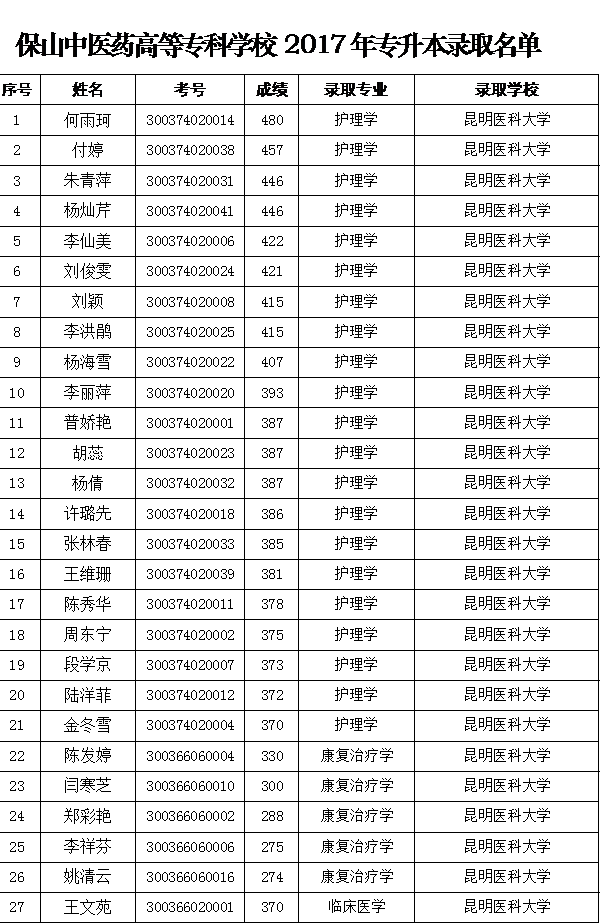 保山中醫(yī)專2017年專升本錄取名單(截止2017.06.06)