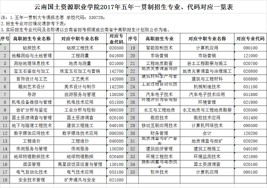 云南國(guó)土資源職業(yè)學(xué)院2017年五年一貫制招生專業(yè)、代碼對(duì)應(yīng)一覽表