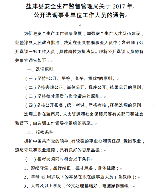 2017年昭通市鹽津縣安監(jiān)局選調(diào)事業(yè)單位工作人員通告