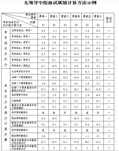 (3)每個(gè)面試考場(chǎng)人員安排為考官7人(主考官1人,其他考官6人,面試考場(chǎng)成立面試考官小組,主考官為面試考官小組組長(zhǎng)),計(jì)分2人,引導(dǎo)員1人,人大監(jiān)督員1人,政協(xié)監(jiān)督員1人,考生一般每個(gè)考場(chǎng)每輪8人左右。