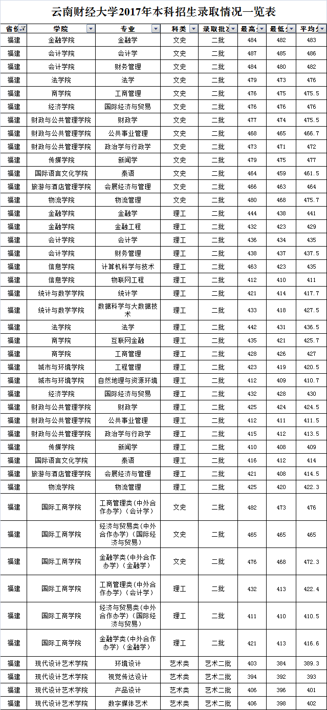 云南財(cái)經(jīng)大學(xué)2017年福建省錄取情況一覽表