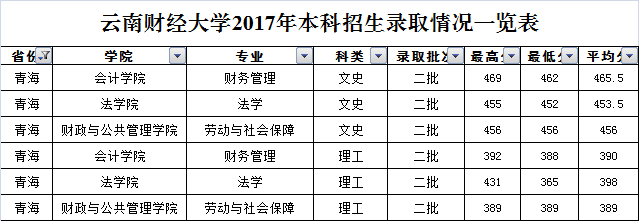 云南財經(jīng)大學(xué)2017年青海省錄取情況一覽表